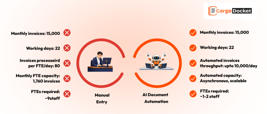 The image describes how the same invoice volume leads to very different operational outcomes. Manual processing slows teams down, increases workload, and demands more staff, while automation accelerates throughput, reduces effort, and enables scalable, high-speed invoice handling with minimal resources.